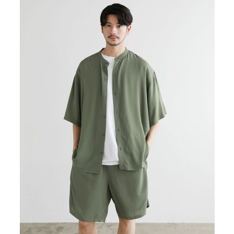 【上下2点セット巾着付き】涼感レーヨン半袖バンドカラーシャツ&ショートパンツセットアップ巾着付き