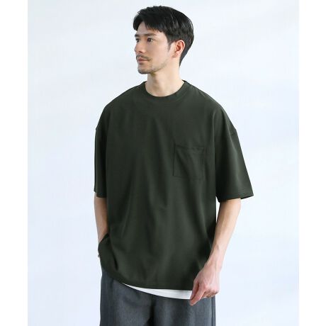 カットソーには伸縮性の高い梨地生地を採用しました。表面に梨のように細かな凹凸があるため肌の接触面が少なく、ドライタッチで清涼感のある生地です。べたつきにくく、日本の蒸し暑い気候でも爽やかな着心地が続きます。動きに合わせて揺れ動くドレープ感もあり、通常のカット地よりも品の良いキレイめな印象を与えてくれる生地となっております。