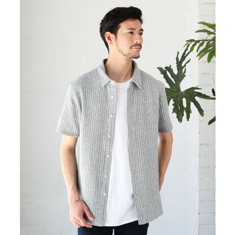 とても軽く優しい肌触りの半袖シャツです。表面の凸凹によって生まれるストライプ柄と、優しく体にフィットする夏向けのニット素材が、スリムなシルエットを生み出します。伸縮性と通気性に優れた生地は動きやすく、汗ばむ季節でも爽やかな着心地です。