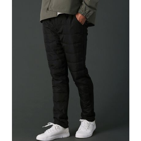 いくら暖かくて穿き心地が良くても、見た目がかっこよくなければコーディネートには取り入れられません。お洒落に見えることにも妥協せずデザインしました。前後ろ全周にダウンを詰めてしまうとモコモコとした不格好なシルエットになってしまうので、前と後ろとで生地が異なる切替デザインを採用し、ダウンフェザーはあえて前身頃側だけに詰めることに。イージー仕様のウエストにはベルトループも付け、ラクな穿き心地ながらタックインスタイルも楽しめる設計にいたしました。ゴルフウェアとしても活躍してくれる、暖かくてかっこいいボトムスです。