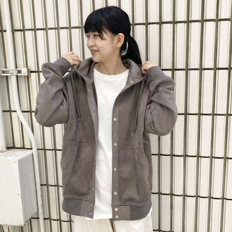 ゆったりとしたサイズ感のスナップボタン開きハイネックパーカです。