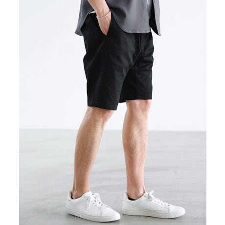 コーディネートを邪魔しない、シンプルなデザインのコットンツイルショーツ。横に広がらない細めのシルエットに設計し、ハリのあるツイル生地を用いることで子供っぽい印象にならないように作り上げています。ウエストはゴムになっており、脱ぎ穿きも楽々。爽やかでラフな着こなしが楽しめる、大人向けの夏パンツです。