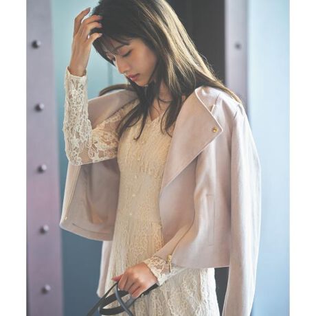【商品特徴】やわらかいフェイクスエードを使用したノーカラーのライダースジャケットブルゾンです。ライダース特有のカジュアルなイメージが強いアイテムですが、装飾を省いたミニマルなデザインと優しいニュアンスカラーがぐっとフェミニンな表情に見せてくれます。ONもOFFの日にもきちんと見えを叶え、コンパクトめに羽織れるサイズなので女性らしさ抜群です。【スタイリング】スカート、パンツ、ワンピースまでお好きなテイストでカジュアルも綺麗めにも活躍します。【素材】柔らかくしなやかなスエード調素材を使用。