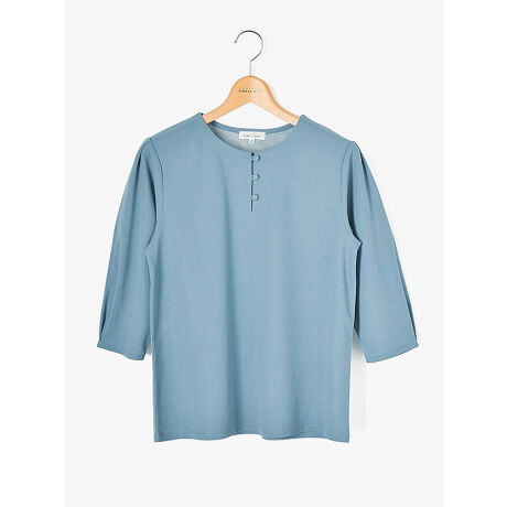 布帛ライクな素材できちんと感がありながらも、着心地のいいカットソー素材で快適に着用いただけるアイテム。袖タックと胸元のクルミ釦デザインがワンポイントで、1枚で様になる1着です。ポリエステル素材で、シワになりにくくお家で簡単にお手入れできるのもポイント。ワイドパンツにも合わせやすい短め丈で着回し力があります。デニム合わせでカジュアルに着こなすのもあり、ストレートパンツできれいめスタイリングもオススメです。