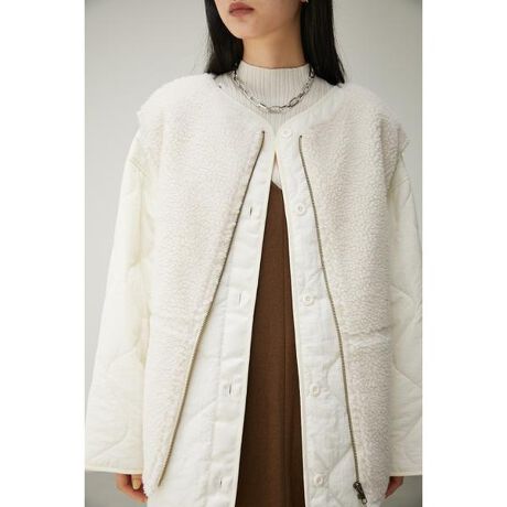 2022Autumn&Winter item・ジャケット部分にはシボ感のあるナイロン生地使用し、中わたをキルトステッチをしています。・ベスト部分にはボア生地を使用し、両方とも単品でも重ねても着用できるように着丈やアームホールのバランスに拘りました。・ベストの肩幅をフレンチスリーブではなくノースリーブにしている為、肩幅がすっきり見えるデザインです。・キルティングの柄が変形ダイヤ柄で、アウトドアライクなデザインになっているのもポイントです。・ベストもブルゾンもどちらもポケットが多く付いていて便利な仕様になっています。<コーディネート>・ワンピースやスカートと合わせてレディライクなスタイルに。・ワイドパンツと合わせてCOOLなスタイルに。