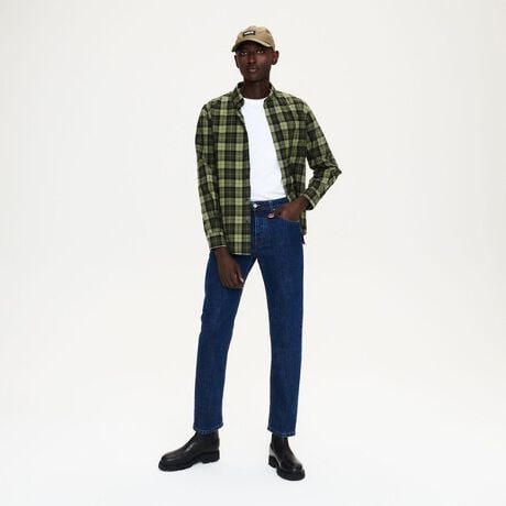 すっきりとした印象のストレートタイプのデニムパンツです。シンプルながらもエレガントな雰囲気が、カジュアルスタイルをアップデート。経年変化の色落ちも楽しんでいただきたい、長く履き続けられるアイテムです。100%オーガニックコットンを使用しています。