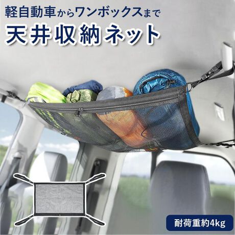 車の天井を有効活用できる収納ネットが登場!車のアシストグリップ4か所にバックル付きのベルトを取り付けるだけで使える♪ワンボックスカーから軽自動車までマルチに対応。アウトドア用品やお出かけ時の荷物置き場におススメ。天井の空間を使うから運転中や乗車中の邪魔にならない。(耐荷重約4kg)ファスナー付きのポケットもあるので、内部に荷物を入れることも可能。メッシュタイプなので、何を収納しているか一目でわかるのがうれしいポイント。