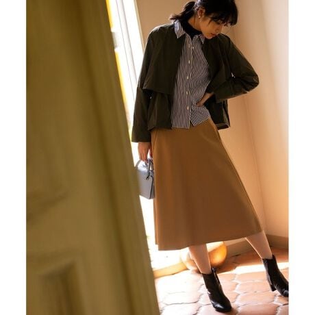 ■デザイン裾の広がりが美しいシルエットのフレアスカートは、動くたびに揺れる裾が魅力的な一枚。タテのラインを強調するハの字に切った切り替えがポイントで、ウエストをすっきりとみせ、ハイウエストで着用いただくことで脚を長く見せてくれます。また脇線をなくすことで自然なフレア感をだしており、腰まわりからウエストにかけて素材とデザイン線ですっきりと吸い付くようにみせています。後ろがゴム仕様になっており、イージーな着心地はありながら、後ろのゴムは着用すると、なくなる程度の分量感にすることでゴムの入ったカジュアルなスカートに見せないようにしました。鮮やかなピンクとクラシカルなキャメル、キレイ目にも使えるネイビーの3色展開です。
