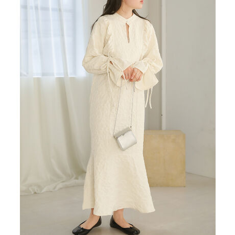 今年注目のジャガード素材を使用した、前後2WAYで着用できるワンピースです。胸元の立体的なギャザーと、胸元のあきがポイントになっています。袖もフレアからリボンを絞ってメリハリのある袖にアレンジすることもできて機能的です。ゆとりはありながらも、ハイウエスト切り替えと脇の切り替えですっきりとしたIラインシルエットがすらっとした印象に見せてくれます。