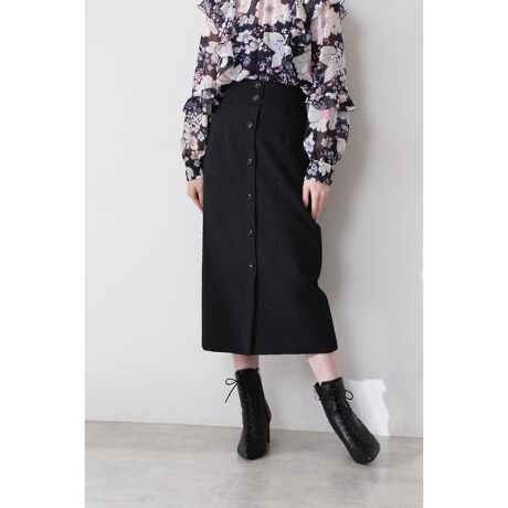 ジルオリジナルのマトラッセジャガードを用いたタイトスカートラメ糸を織り込み、程よい光沢感のある特別感のある生地を使用。フロントのボタンデザインがアクセントとなり、縦のラインをすっきり見せてくれます。タイトデザインですが、ボディラインを拾いすぎないサイズ感で仕上げました。ダイヤ柄のように見えるオリジナル生地をポイントに、ブラウスやニットをあわせると大人フェミニンな装いに。