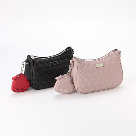 ハートのキルティングがとてもキュートなハーフムーン型バッグです。コーデに取り入れるだけで洗練されたオシャレ感を演出してくれます! ハートミニポーチつきで、気分に合わせて取り外せるのがうれしいところ。ショルダーの長さを短くしてハンドで持っても、肩からかけても収まりがよく、使い勝手は抜群です。大人っぽいロゴプレートも高級感があり◎。ガーリーにもカジュアルにも合わせやすく、万能に活躍すること間違いなしです。≪重さ≫F/本体:約260g ポーチ:約40g