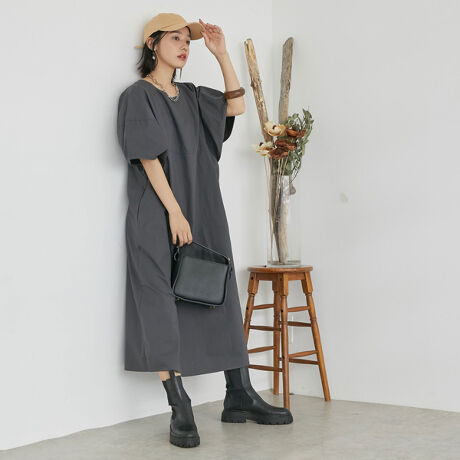 袖のボリュームがポイントのワンピース。ハリのあるタイプライター素材なので、立体感のあるシルエットを際立たせます。パープルはカジュアルな印象で、お出かけに映えるカラー。グレートブラックは、小物次第でフォーマルな印象にも。