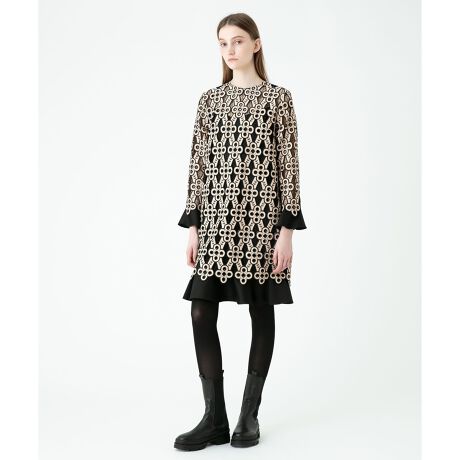 トルコのブロッシェ(エスター社)のインポートレースを使用。個性的な幾何学レースが目を引くワンピースです。ストンとしたシルエットの身頃に別布のフリルを裾からレイヤードさせてポイントにしています。足元はタイツやロングブーツと合わせたり、スリムパンツを合わせてチュニックっぽく着こなすのもおすすめです。