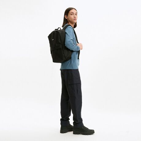アーバンライクなミニマルデザイン\n\n-素材の特徴-\nリサイクルナイロン100%\n\n-デザインの特徴-\n利便性とデザイン性を兼備したミニマルデザイン\n\n-サイズ感-\nW25cmxH42xD14cm / 17L\n\nリサイクルの再生繊維を使用したデイバッグです。容量たっぷりのメインコンパートメント内にはPCスリーブ、水筒や折りたたみ傘を収納できる両開きのサイドポケットを配置するなど、利便性も兼ね備えています。