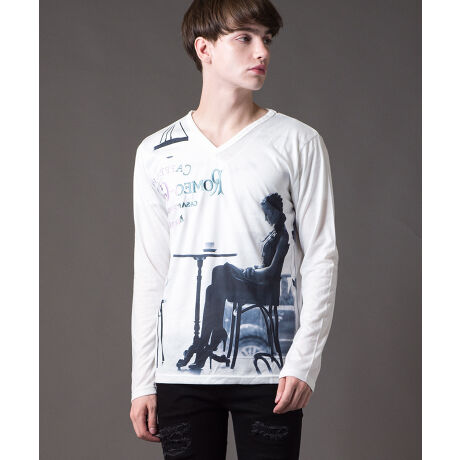 オシャレなイタリアンカフェでのワンシーンを切り抜いたオリジナルプリントのVネックロンT。
