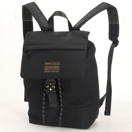 ナイロンツイルのバックパック、トップハンドル、上蓋はウェルトジップポケット付きフロントフラップでマグネット式バックルで容易に脱着が可能 。調節可能なショルダーストラップ、背面はクッション付きメッシュ仕上げ、フロントにREPLAYカスタマイズラベル、 横26.5センチメートル、 高さ41センチメートル、 マチ12センチメートル。