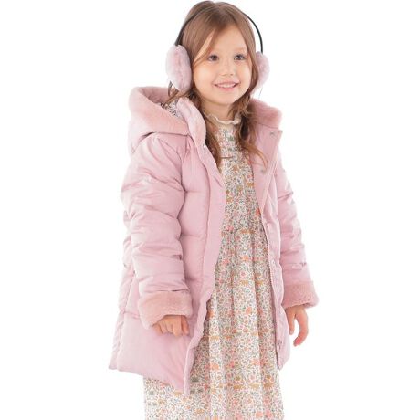 フードにあしらったフェイクファーやリバティプリントが可愛らしく、カジュアルになりがちなダウンもぐっと上品な印象に◎