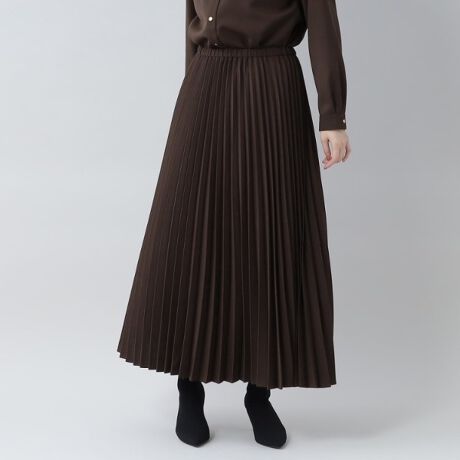 クリアな質感とシャープな印象が持ち味のプリーツスカートには、千鳥ジャガードニットやバルキーな杢ニットなど優しい風合いとのスタイリングが似合います。
