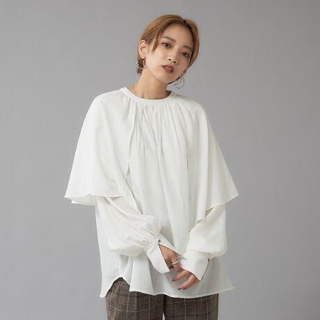段違いになったフリルカラーがポイントの立体感とデザイン感が強い、1枚で様になる主役ブラウス。