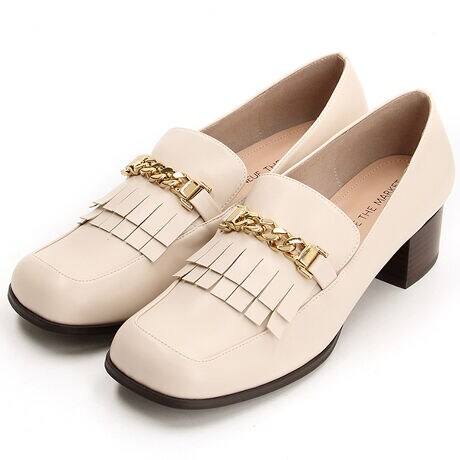 ゴールドのチェーンモチーフとキルト付きでアクセントをつけたローファー。太めのヒールで安定感も抜群なデザイン。投入するだけでクールでトラッドな雰囲気に。[型番:TM22473]