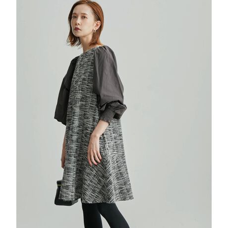 ・身頃にクラシカルなツイード生地を、袖に布帛生地を用いた、異素材切り替えのワンピース。