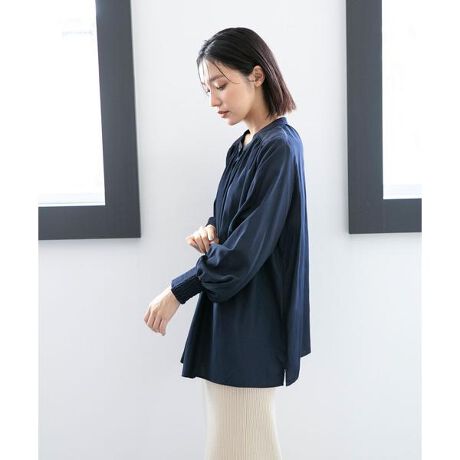 違った表情を楽しめる前後2wayデザインのブラウス。胸元や袖口にたっぷりギャザーを寄せたフェミニンなデザインが魅力的。前後で異なる袖カフスのデザインなど細部のディテールにも拘りが光ります。程よい光沢感が上品でオンもオフも好印象に映るアイテムです。