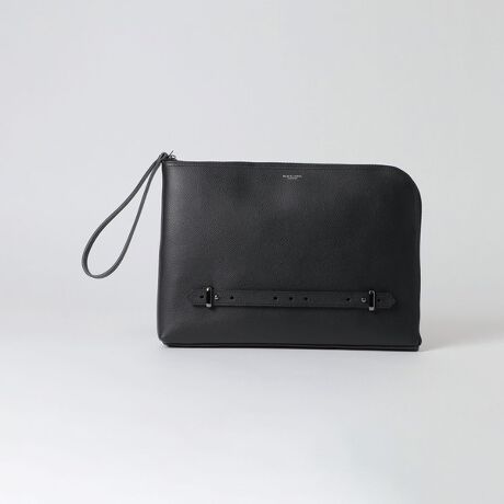 しなやかな質感のレザーにシュリンクの型をプレスしたクラッチバッグ。ハンドル部分はデザインアクセントだけでなく、バッグ本体を固定して持ちやすく設計した仕様です。さりげなく箔押ししたブランドロゴが上品な雰囲気を演出します。