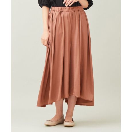 スカート見えするキレイめガウチョパンツPOINT●ゆったりシルエット&ウエストゴム●軽やかな素材でスカート見え●ポケット付き●マシンウォッシュ可能■デザイン前後差をつけた裾デザインと軽やか素材が華やかな印象のガウチョパンツです。ボディラインを拾いにくいゆったりとしたシルエットのパンツながら、スカート見えするので女性らしい印象に。足さばきも良いので、デイリー使いはもちろん自転車に乗る際にも重宝します。ウエストがゴム仕様のため着心地が良く、ポケット付きなのも嬉しいポイント。■素材落ち着いた印象のサテン素材です。※画像はサンプルを使用している為、実際にお届けする商品と仕様、加工、サイズが若干異なる場合がございます。予めご了承ください。※モデル画像は撮影環境の都合上、実際の商品と色味が異なって見える場合がございます。色味は商品画像をご参照ください。