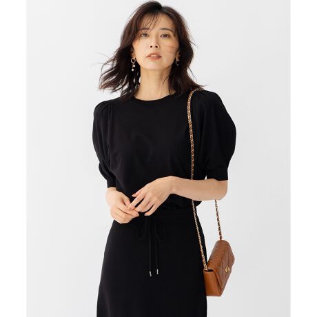 ボリュームのあるパフスリーブとややコンパクトな身頃でバランス良く仕上げた半袖ニット。季節の変わり目にお召いただきやすいよう、ボディーラインを拾わない程度に繊細に軽く仕上げた素材感です。目の詰まったクリーンな表面感と立体的なパフシルエットはブラウスのような上品さがあり、オフィスシーン等でも取り入れやすい1枚です。合わせるものを選ばない色展開で、同シリーズのスカートとのセットアップとしてはもちろん様々なコーディネートを楽しんで頂けます。ベーシックなブラック(#005)、深い濃紺のネイビー(#075)、柔らかい印象のモカ(#030)の3色展開です。