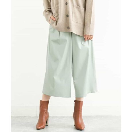 トレンド感のある素材でいつもと違った雰囲気に着こなせるガウチョパンツ。強くなりがちなレザー調素材を女性らしいやわらかいカラーで履きこなしやすく仕上げました。