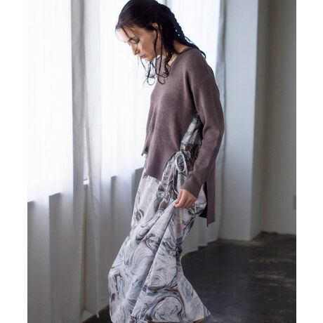 ニットプルオーバーに、スカートをコーディネートしているようなセパレートタイプに見えるワンピース。