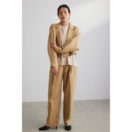 モデル身長160cm(フリーサイズ着用)ドルマンスリーブで抜け感のあるショートテーラード。シンプルなディテールでスタイリングしやすい一枚です。シワになりにくく、落ち感と程よいハリのある素材を使用しています。500FAS31-0600(ハイウエストツータックパンツ)とセットアップ着用可能。ストレッチあり、透け感なし。【お手入れ方法】マシンウォッシュ可