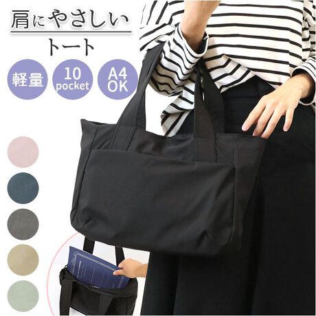 重い荷物を入れても肩が痛くなりにくい!「肩にやさしいトート」が登場。とっても軽量で肩にやさしい、こだわりの詰まったトートバッグ♪収納力のある10ポケット付きで、使いやすさ抜群!クッション性の高いワイドハンドルで、肩への負担を軽減!ハンドル部分に2本のステッチを入れることで、肩に掛けた時も滑りにくい◎メインルーム開口部はファスナー式で中身が飛び出しにくく、プライバシーをしっかり確保。内側は明るい色の裏地を使うことで中身が見えやすい仕様。A4サイズ対応で、ファスナーポケット×1、オープンポケット×4、ボトルポケット×1を装備。(※カラーにより裏地の色が異なります。)前面のファスナーポケットは、スマホやパスケースなどサッと取り出したい小物類の収納に便利。オープンポケット×1付き。背面にはオープンポケット×2を配置。見た目以上の大容量!デイリー使いはもちろん、小旅行の際にも活躍♪