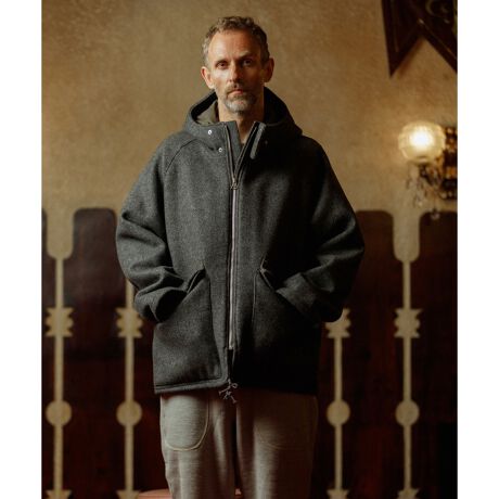 グレーのメランジェが特徴的なダブルフェイス素材を使用し、ハリのある男らしい素材感が特徴です。