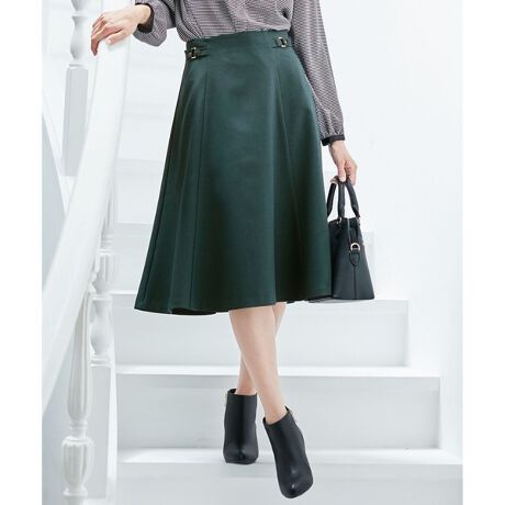 程よくフレアの入ったシルエットに脇に付いたバックルがポイントになったスカートです。後ろファスナーー開き、後ろのみゴムが入っているので楽に着て頂けます。
