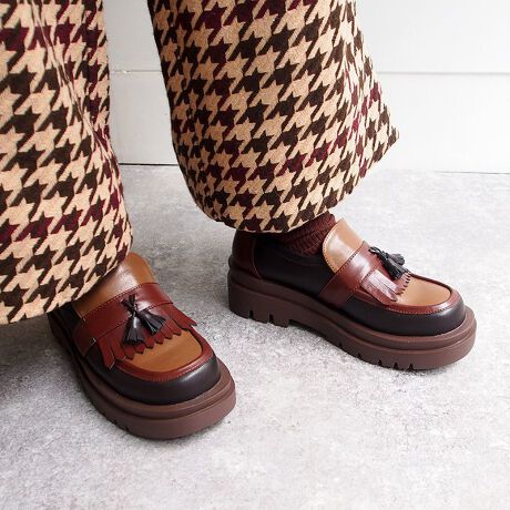 秋冬を感じさせるレトロカラーのコンビネーションやタッセルが目を惹くデザイン。ボリューム感のあるフォルムや二段になった厚底ソールがメンズライクなbyあしながおじさんらしい一足。