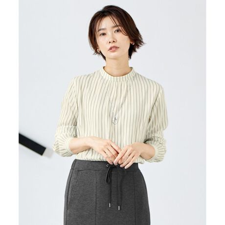 【洗える】シルクタッチ ダブルストライプ スタンドカラー ブラウス