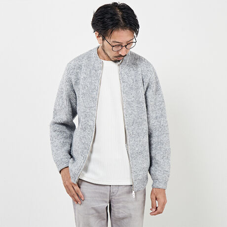 深みのある色合いが特徴のシャンブレーヤーンを使ったZIPカーデです。クルーネックセーターとカーディガンの良さが合わさったハイブリットモデルです。