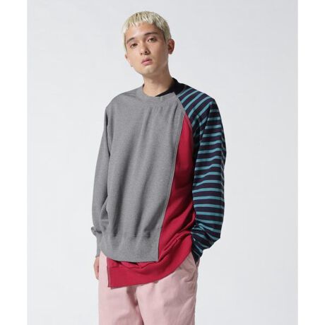 独自のカラードッキングで仕立てられたユニークなデザインのクルーネックスウェット。