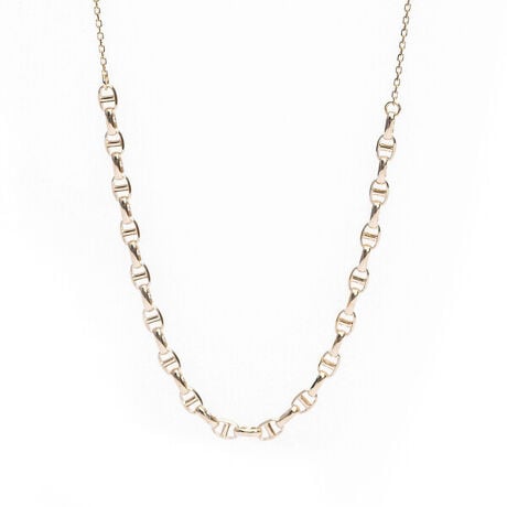 スカルチェーンとアズキチェーン、2種類のチェーンを組み合わせた使い勝手の良い地金ネックレス。