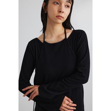 モデル身長165cm(Mサイズ着用)Uスリットがポイントのロングワンピースにホルターネックのエプロンををレイヤードしたセットワンピース。さらりとしたリブカットソーで縦ラインを際立たせるシルエットです。ホルタートップはデニムと重ねたりアザースタイリングも楽しめます。ストレッチあり、透け感なし。【お手入れ方法】マシンウォッシュ可