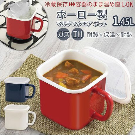 保存容器としてはもちろん、そのまま加熱もできる!ホーローマルチスクエアポットが登場。耐酸性、保温性、耐熱性に優れたホーロー製。ニオイがつきにくく色移りしにくい!雑菌が繁殖しにくいのも嬉しいポイント◎冷蔵庫内でも場所を取らない角型タイプ。出し入れに便利な取っ手付き。作り置きおかずやお味噌の保存に便利♪冷蔵保存していたおかずを容器のまま温め直し、食卓に出してもOK。容量は1.45リットル。パスタ1人前(100g)やレトルト食品の温めにもちょうどいいサイズ感。ガスコンロやIHクッキングヒーターなど6つの熱源に対応。多くの調理器具を生み出している、新潟県燕市で作られたスクエアポット。プレゼントにもおすすめ。