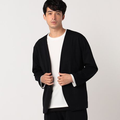 すっきりとしたノーカラーデザインの、ジャージージャケット。