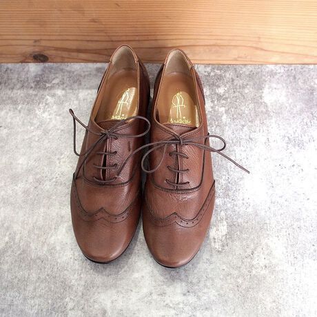ウィングチップのベーシックなひも靴を、あしながおじさんらしくころんと可愛く仕上げた一足。革の風合いが感じられ、履き込むごとに味わいの出るベーシックシューズです。