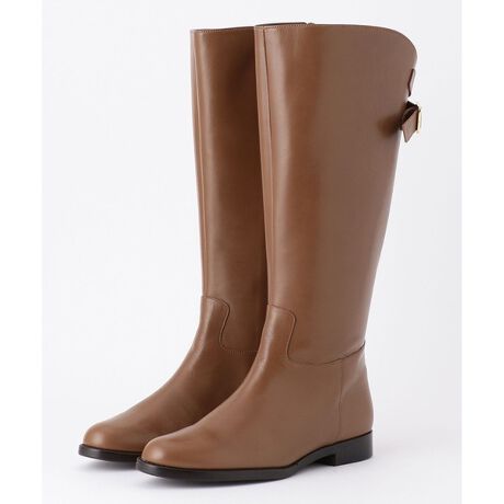 牛革のジョッキーロングブーツ。Lサイズは、履き口に調節可能なベルトがついています。隠しゴムで伸縮する仕様のため、ストレスフリーな履き心地です。内側にジップが付いているため、着脱も楽なブーツです。カラーはブラック(#005)とダークブラウン(#035)の2色展開です。