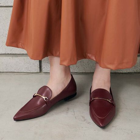華奢なシルエットのポインテッドトゥ&大胆なゴールドのモチーフが映える大人顔なローファー。