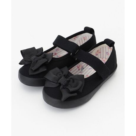 カジュアルに見えすぎない、キャンバス生地のバレエシューズ。真ん中についたリボンがキュートなポイント。マジックテープ使用で、お子様お一人でも簡単に脱ぎ履き出来ます♪中敷きは花柄で脱いでも可愛い仕様に♪セレモニースタイルにも通園通学スタイルにも合わせていただける、万能で大活躍のデザインです。