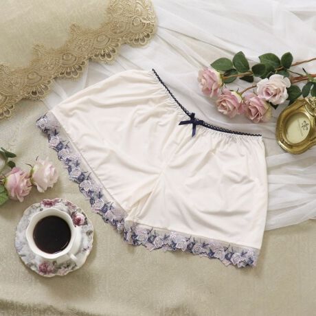 ブラアイテムやキャミソールとお揃いのレースを裾にあしらい、動くたびにひらひらと小花が可愛らしく揺れるアイテムに仕上がりました。