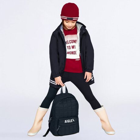 大きく開く開口部がキッズにも使いやすく、タウンユースに適した利便性の高さが特徴のバックパックです。AIGLEロゴとショルダーのダブルストライプがデザインのアクセントに。たっぷり入る大きさながら、軽量な点もポイントです。
