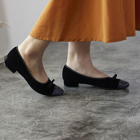程よい2cmの太ヒールは足が疲れない設計で、トゥ先のグリッターで遊び心をプラスしました.。
